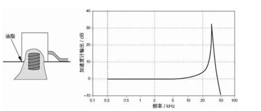 (Diagram showing a typical frequency response curve for a screw-mounted accelerometer with grease) (Caption for diagram: Typical frequency response curve of an accelerometer screw-mounted with grease (relative to the absolute acceleration of the structure at the connection point))