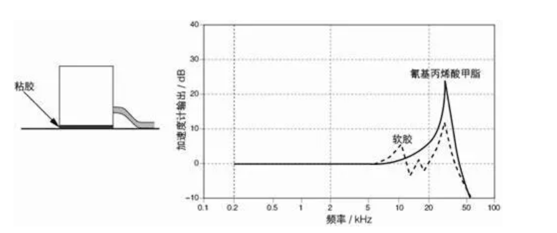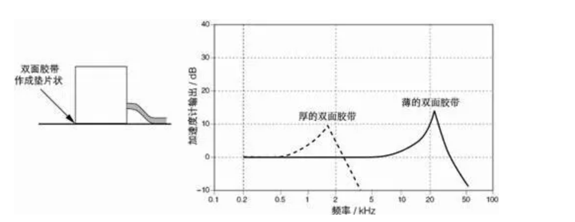 (Diagram showing a typical frequency response curve for a double-sided tape-mounted accelerometer) (Caption for diagram: Typical frequency response curve of an accelerometer mounted with double-sided tape)