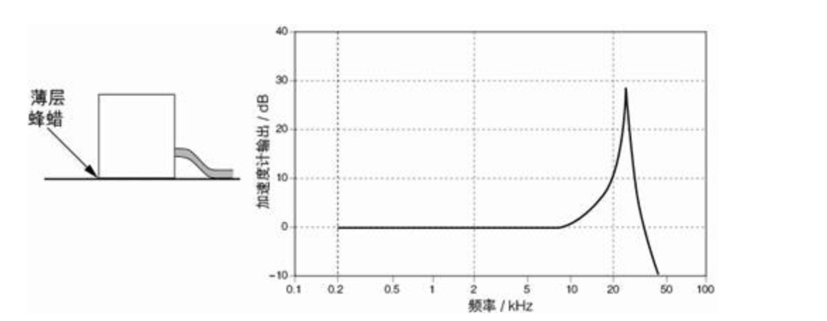 (Diagram showing a typical frequency response curve for a beeswax-mounted accelerometer) (Caption for diagram: Typical frequency response curve of an accelerometer mounted with a thin layer of beeswax (relative to the absolute acceleration of the structure at the connection point))