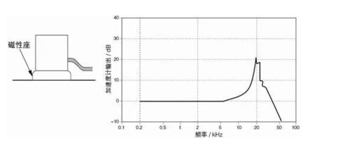 (Diagram showing a typical frequency response curve for a magnetic base-mounted accelerometer) (Caption for diagram: Typical frequency response curve of an accelerometer mounted with a magnetic base)